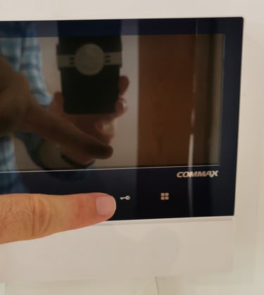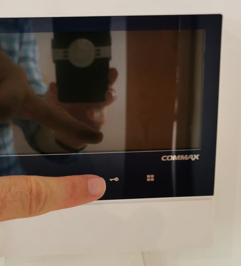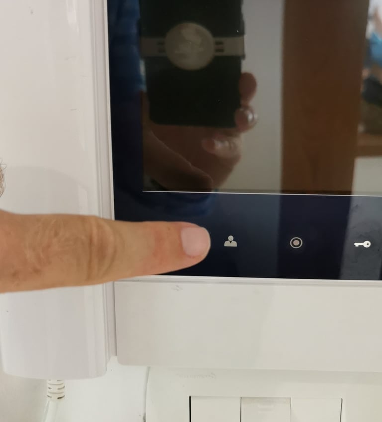 La particularité de ce visiophone est qu'il gère l'ouverture des deux portails. ATTENTION, si vous voulez ouvrir l'un des portails, avant toute chose il faut décrocher le combiné téléphonique (photo 1). Ensuite vous sélectionnez votre portail à l'aide de l'icone représentant un "petit bonhomme". Apparaît alors sur l'écran la vue du portail. Si ce n'est pas celui que vous voulez ouvrir, appuyez une seconde fois sur la même icone (photo 2). Enfin à l'aide de l'icone "clef" vous pouvez ouvrir le portail sélectionné (Photo 3) mais toujours avec le combiné téléphonique décroché !